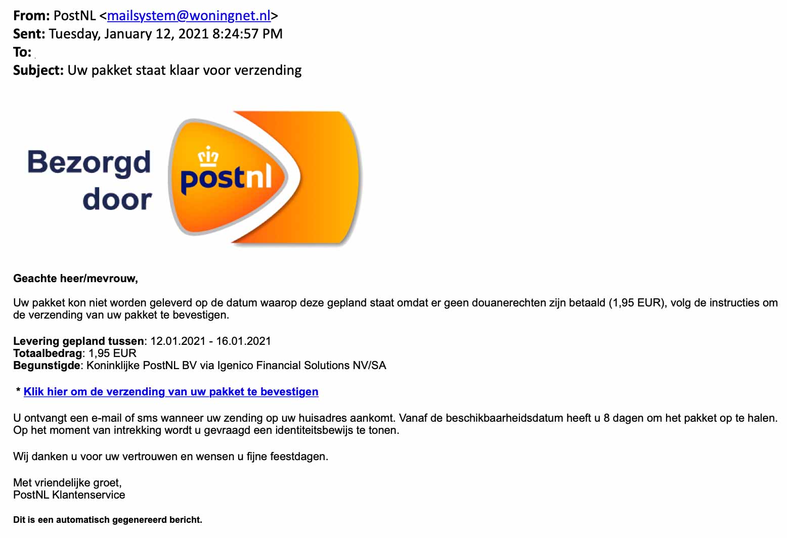 Je kan onze e mails herkennen aan het afzendadres dat eindigt op postnl nl. We hebben vanaf medio mei tot eind juni in 4 blokken een gemene phishingmail gestuurd naar alle medewerkers van onze leden. In deze valse e mails staat dat de belastingdienst nog geen bedrag heeft mogen ontvangen van uw belastingaangifte 2019.