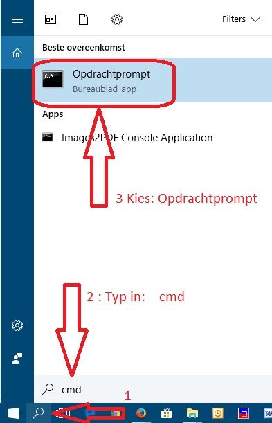 Ga naar het vergrootglas linksonder en tik cmd.