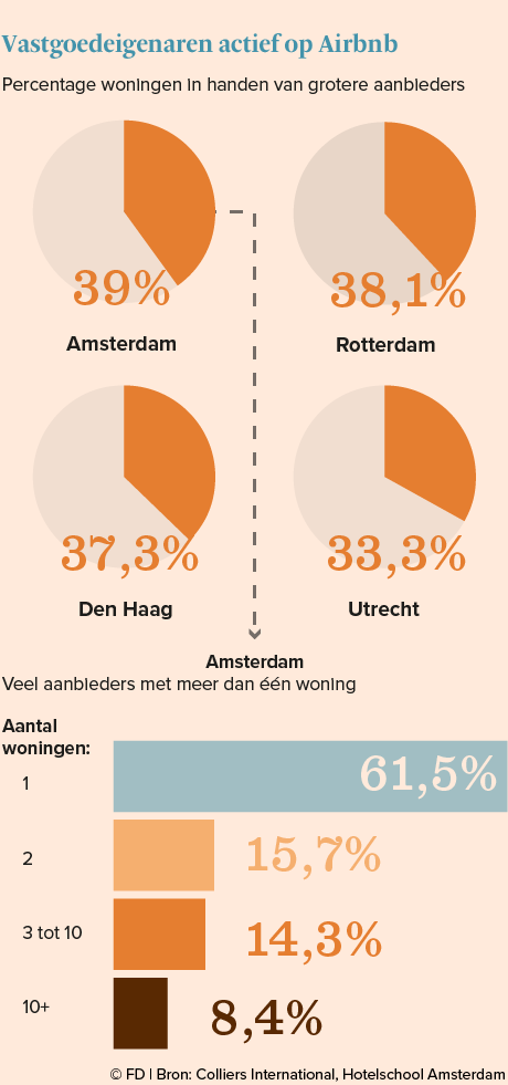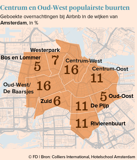 De rappe groei van airbnb in de hoofdstad gaat overigens met de nodige strubbelingen gepaard. Dat meldt het financieele dagblad vrijdag. Bijna veertig procent van de woningen en kamers die in amsterdam via de verhuursite worden verhuurd is in.